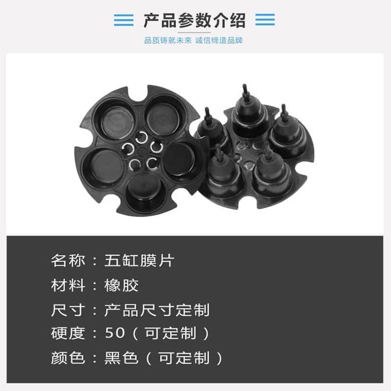 用途:塔型五缸橡胶膜片采用特殊胶料配方,弹性好,挤压后变形极小,能保证长期密封不变形,耐磨、耐油、耐腐蚀,使用寿命长,硬度、尺寸大小、颜色均可定制。